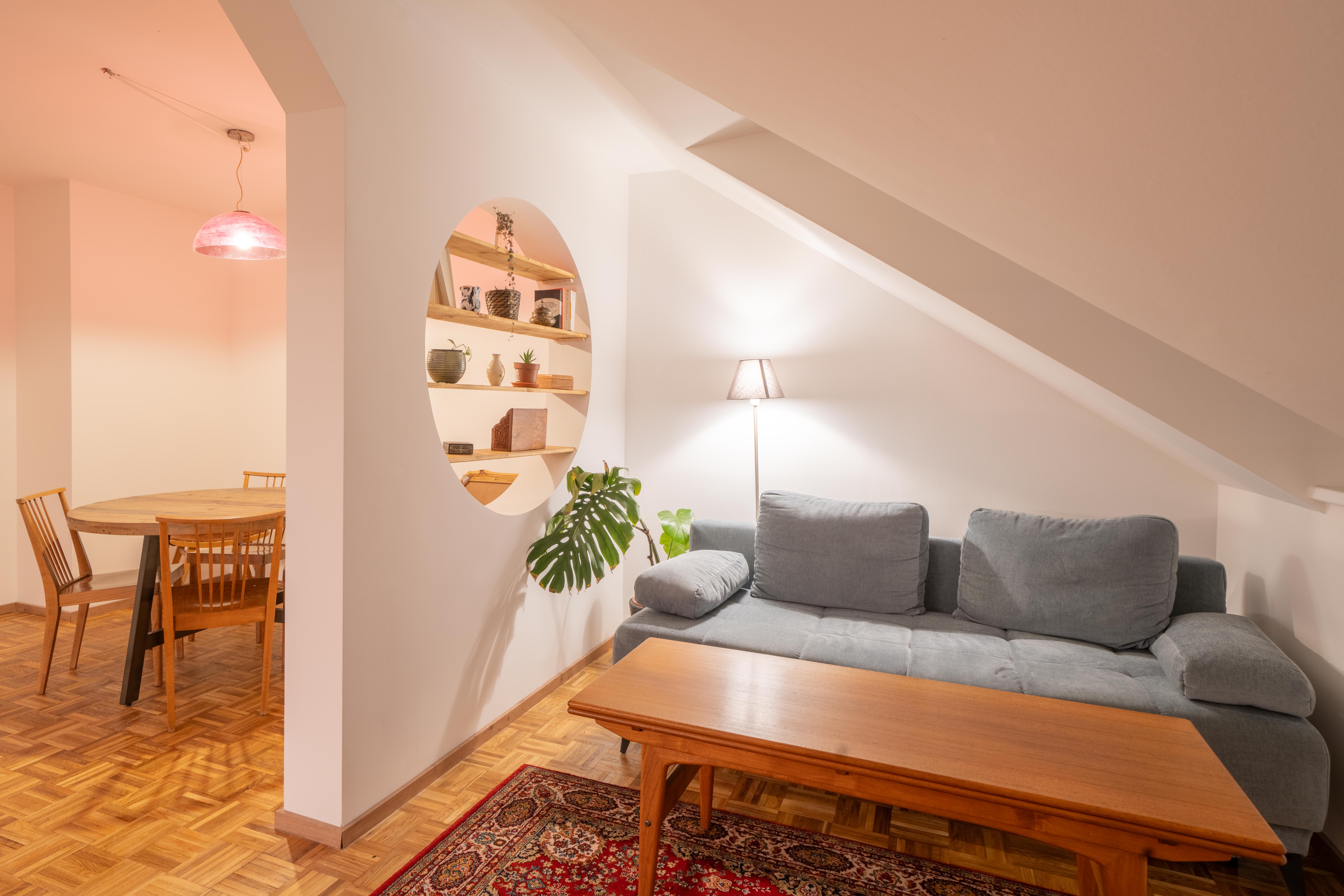 The Bright central Spot has been Robert’s project of heart in the last year – he put in new walls like the one with the circular bookshelf, so that the flat could become what it is today. He thoughtfully chose every piece of furniture so that everything fits together perfectly. In every apartment, he thinks over the interior from time to time, considering the feedback of our guests.